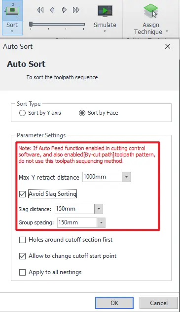 Esta función realiza la verificación de la trayectoria de la herramienta en piezas identificadas con biseles. Los componentes que contengan errores críticos se marcarán con triángulos de advertencia amarillos.